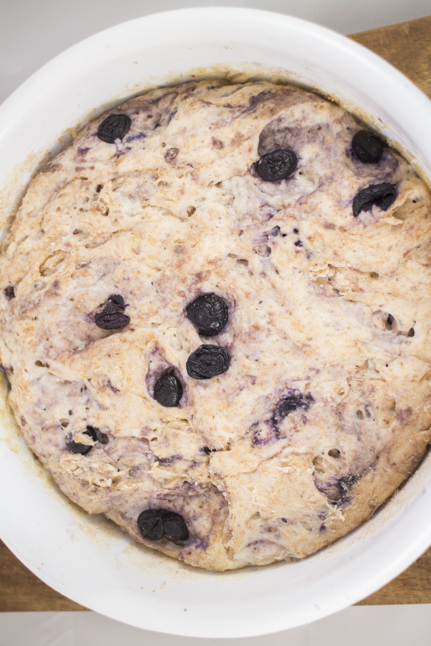 - In a large bowl add 3 cups of flour, milk, yeast mixture and butter. Stir with a wooden spoon to mix. Add the remaining 3 cups of flour, salt and blueberries and continue to stir until everything is combined With your hands, knead the dough for 5 minutes, folding it over again and again.
