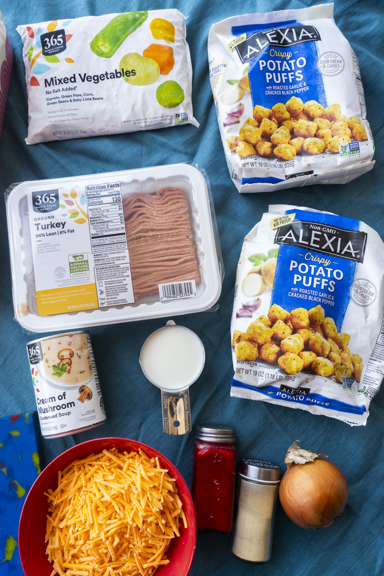 - Tater Tots: Grab a standard family-size bag (around 30 oz). You will use about 3/4 of the bag to cover the top – keep the rest in the freezer for hot dog night. Keep them frozen until you are ready to assemble.