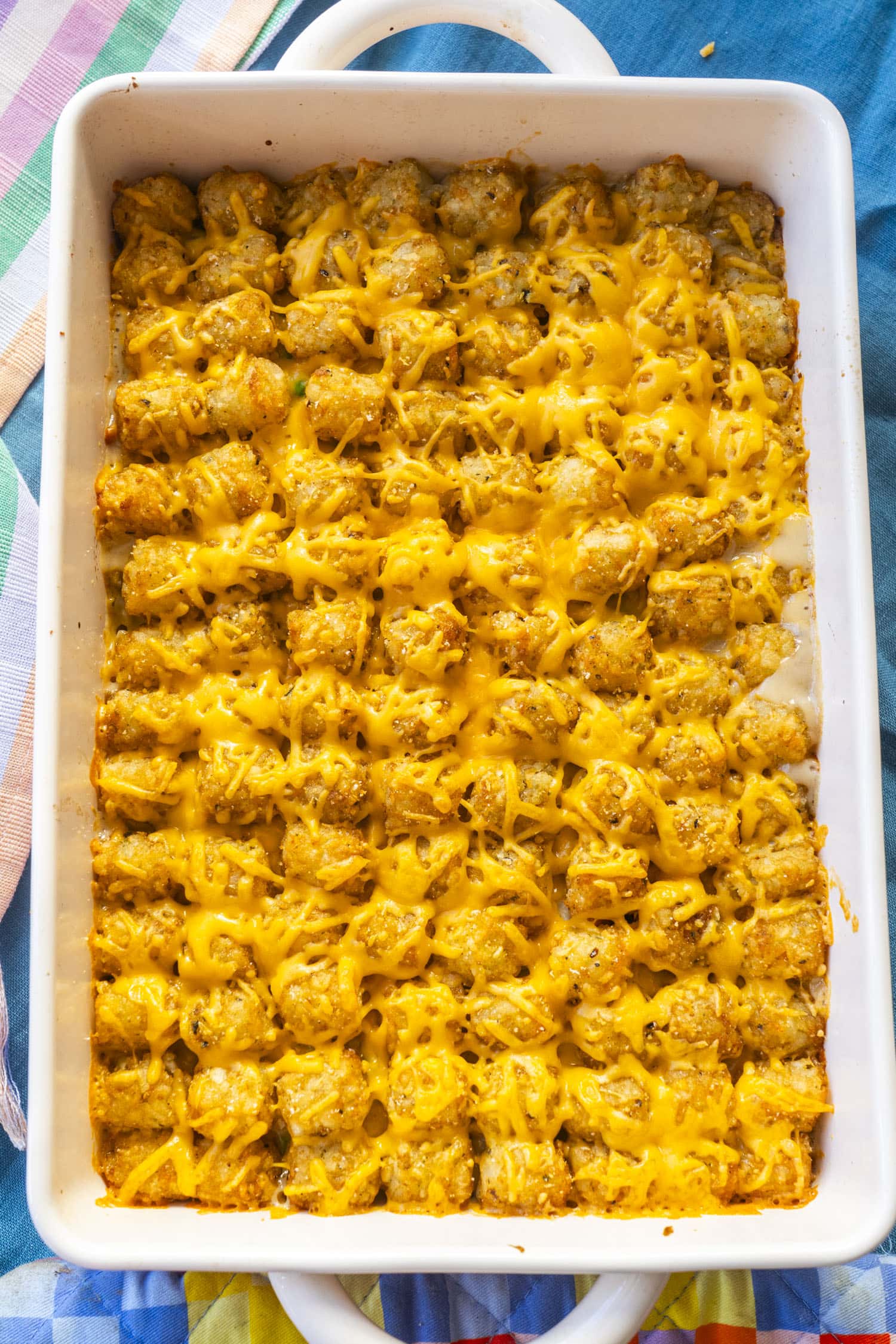 - Arrange the frozen tater tots in a single layer over the cheese. (You want them side-by-side, not piled up, so they get crispy. Put any extras back in the freezer!)
