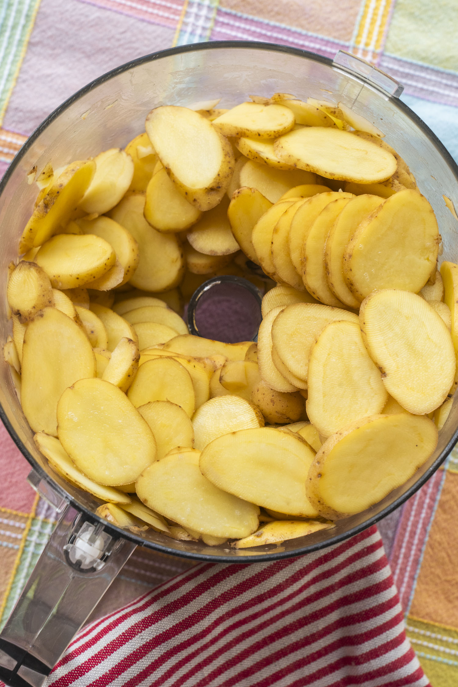- Fingerling Potatoes: You will need 1.5 pounds. I love using fingerlings for this because they have such a creamy, buttery texture and their thin skins mean no peeling required (yay!). If you can’t find them, Yukon Golds cut into chunks are a great substitute. Tip: I use my food processor to slice them – so quick and easy!