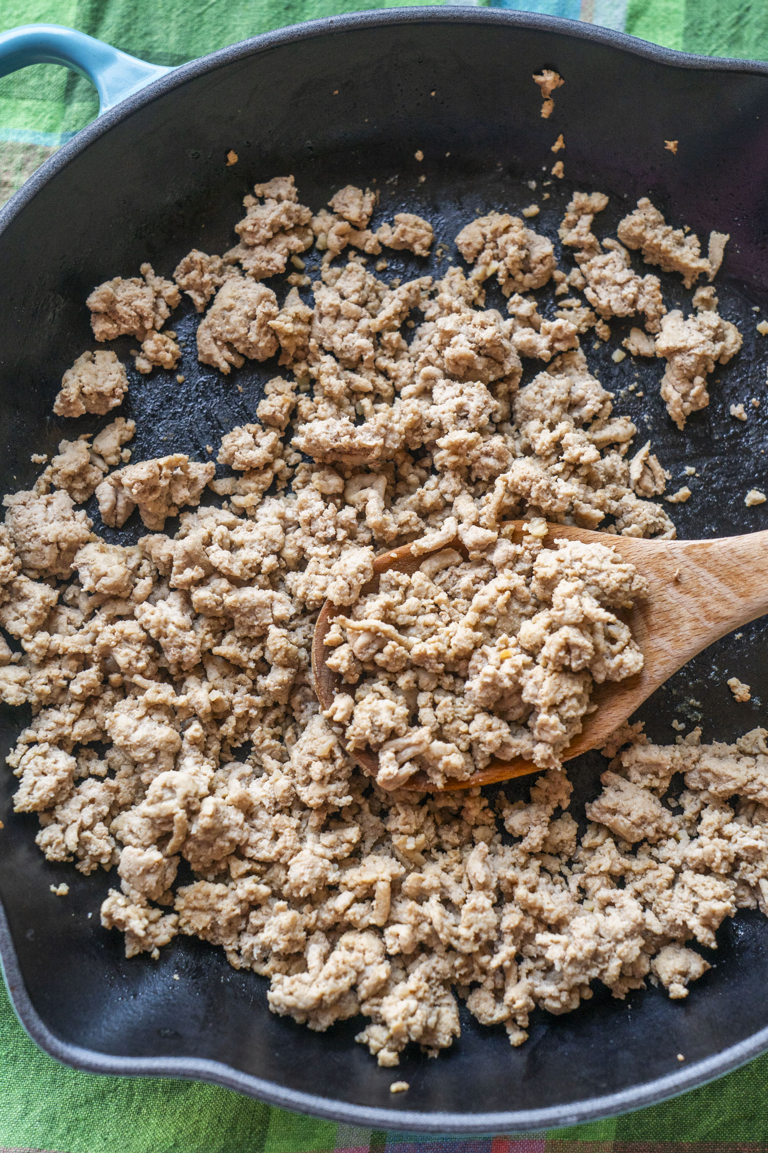 Cook the ground turkey in a skillet until browned and no longer pink. Drain the grease, then quickly stir in the garlic until fragrant.