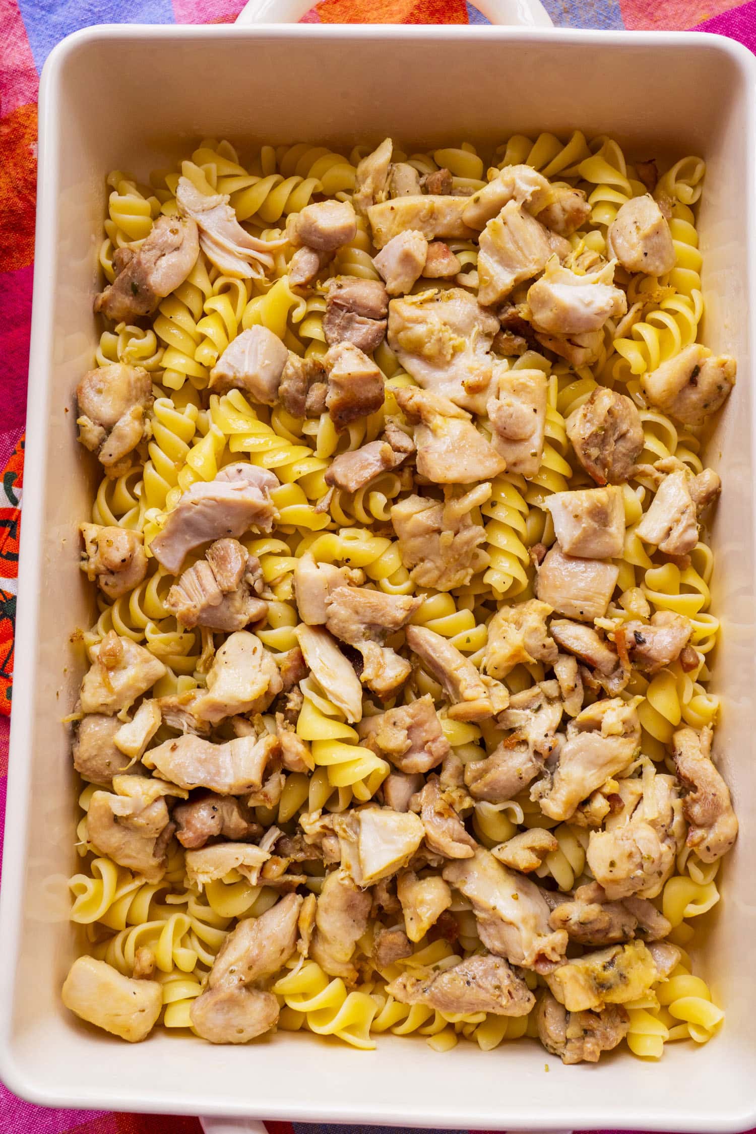 - In a large skillet over medium-high heat, add a little olive oil. Add the bite-sized chicken thigh pieces and season them directly in the skillet with garlic powder, dried oregano, salt and pepper. Cook for 8 to 10 minutes until the chicken is no longer pink, then add the chicken thighs directly into the baking dish on top of the pasta.