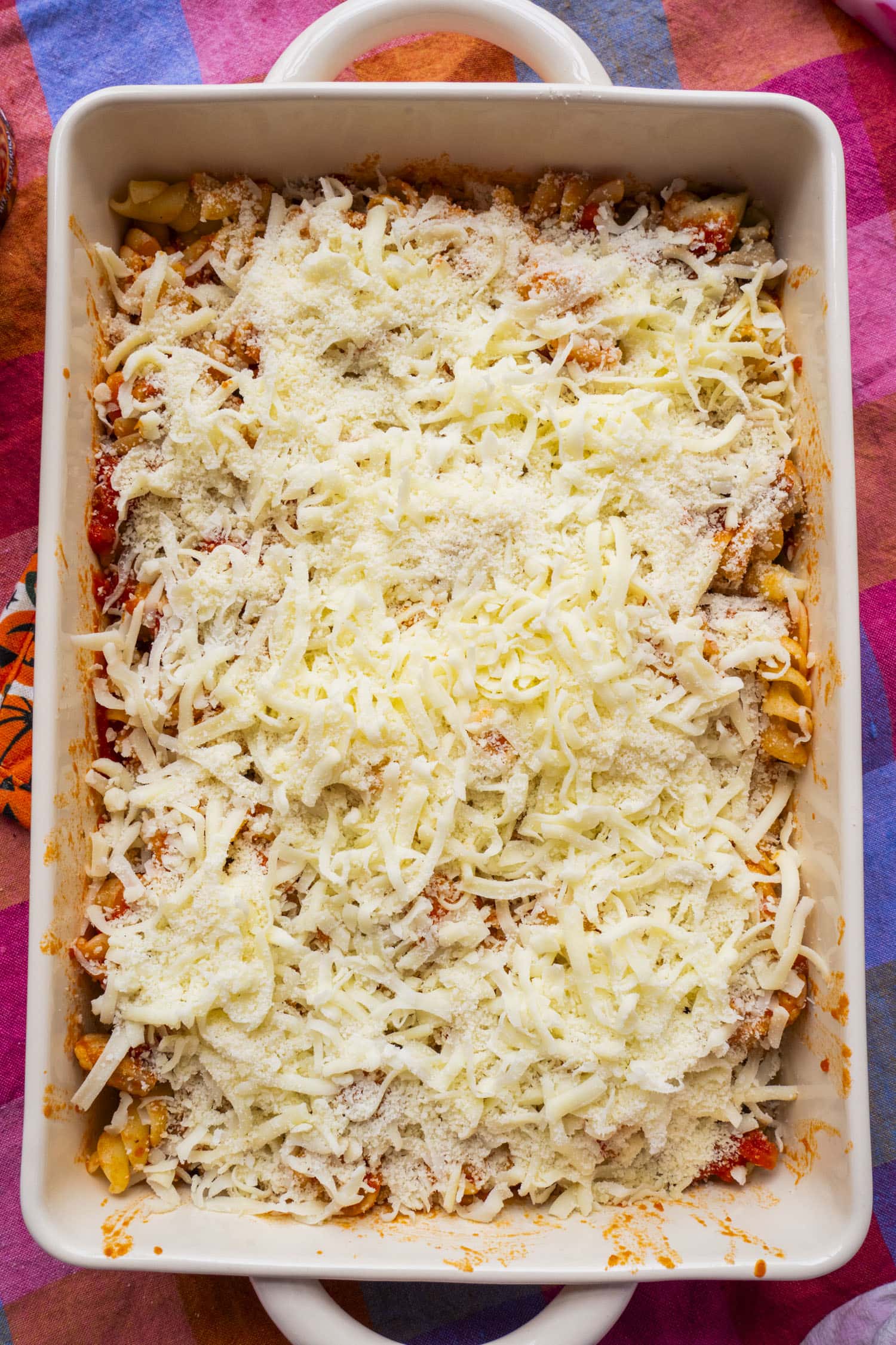 - Spread the mixture out evenly and sprinkle the shredded mozzarella and grated parmesan over the top.