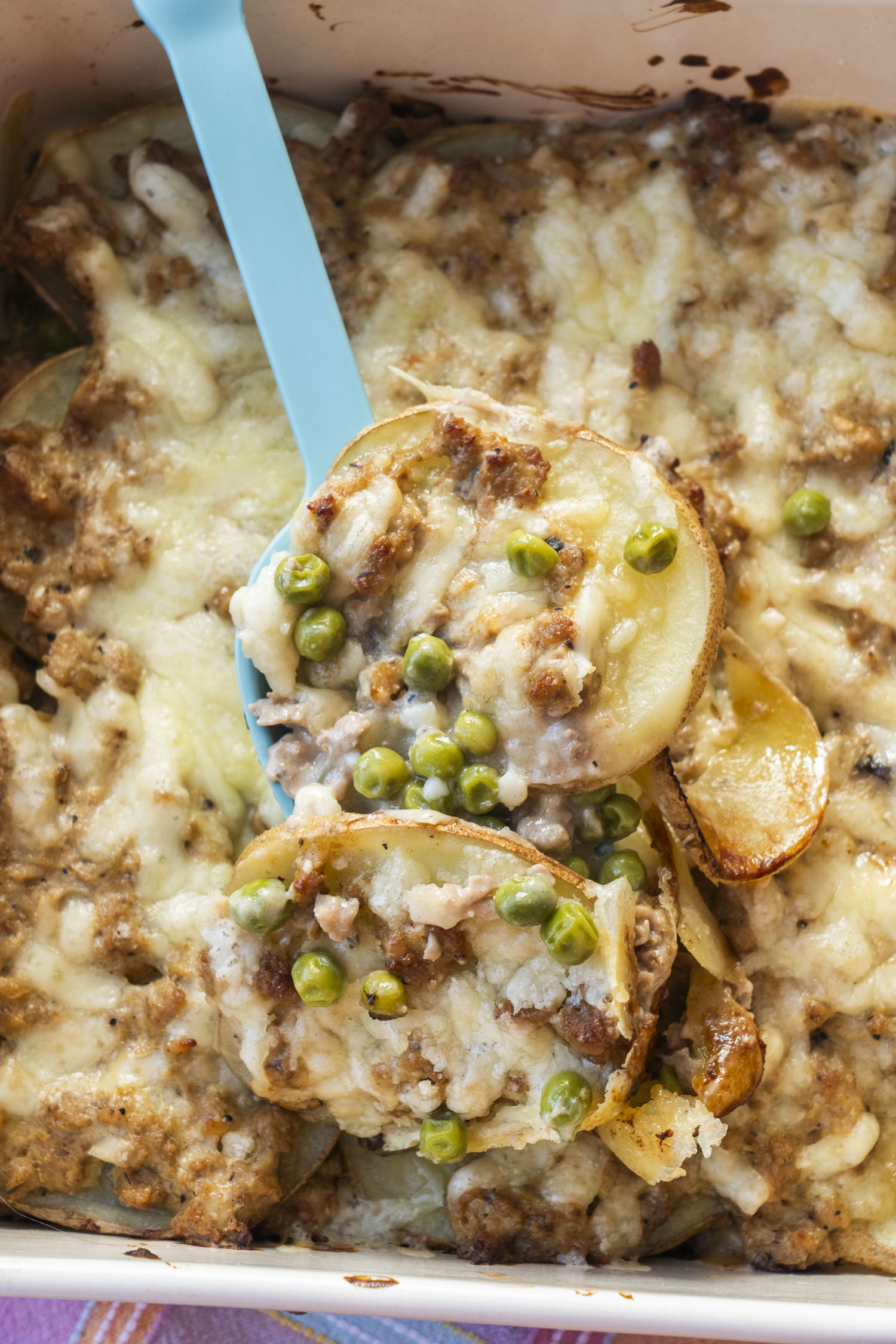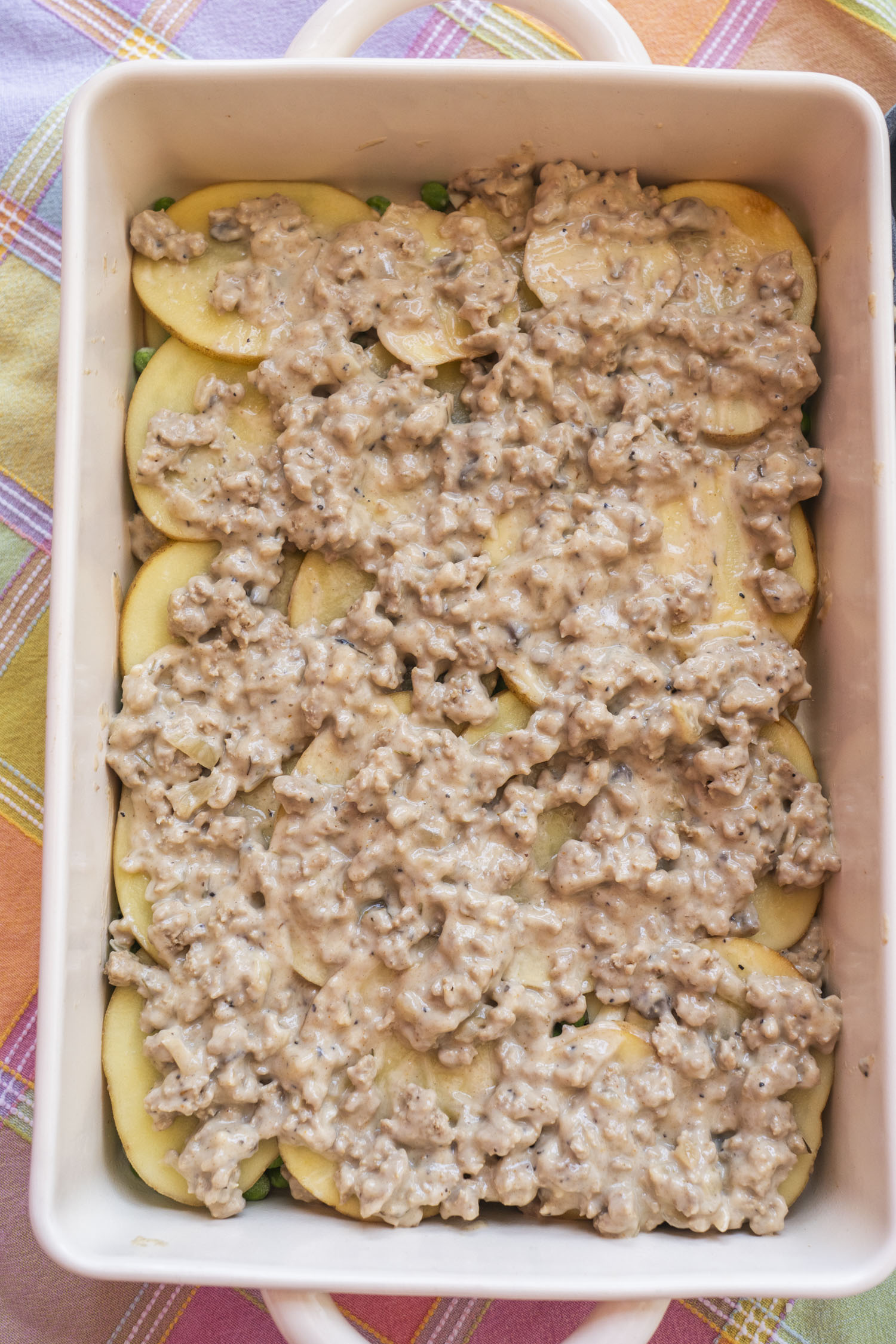 - Arrange half of the sliced potatoes in an even layer at the bottom of the prepared baking dish. Pour half of the creamy turkey mixture over the potatoes, spreading it out to the edges. Sprinkle the frozen peas evenly over the meat, followed by 1 cup of the cheddar cheese.