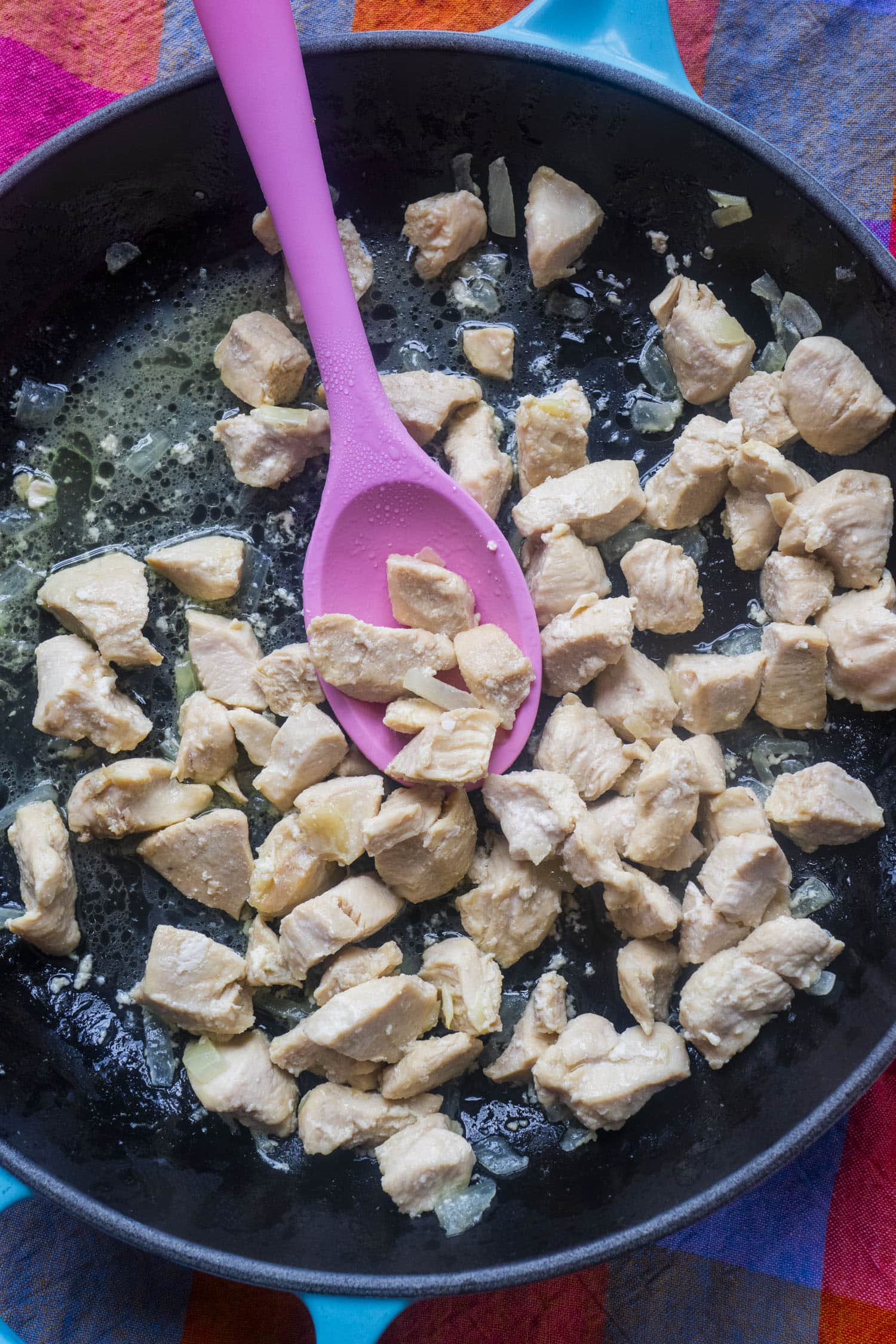 - In a large skillet, melt 3 tablespoons of butter over medium heat. Add the diced chicken and onion. Sauté until the chicken is cooked through and the onions are soft.
