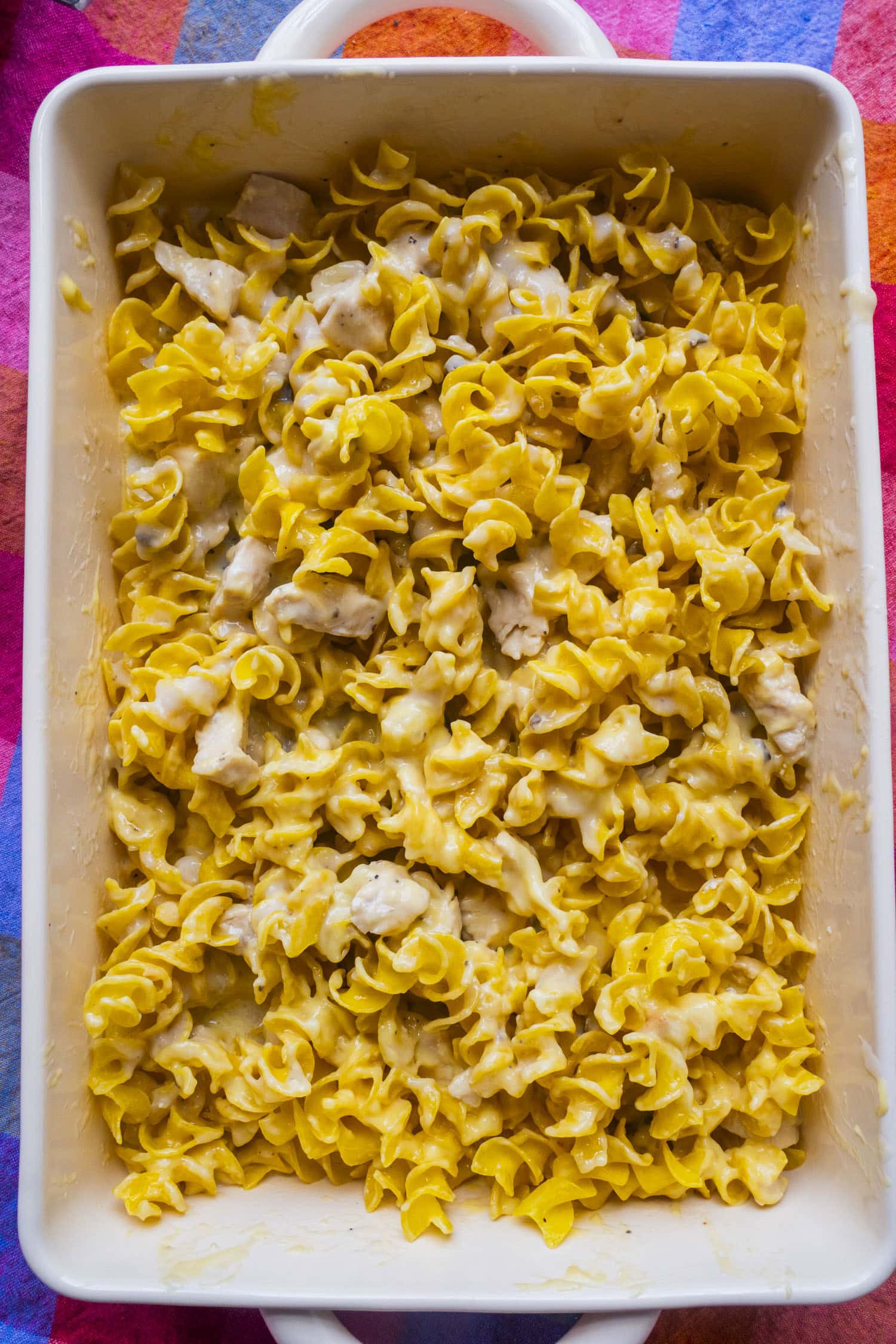 - When it comes out of the oven, make sure to check the noodles in the center of the dish, not just the top layer. The top can look done (and even get a little crispy in spots, which is exactly what you want), but you’ll want to dig down and make sure everything underneath is fully cooked and tender. If the noodles still feel firm, just cover it back up and bake for a few more minutes.
