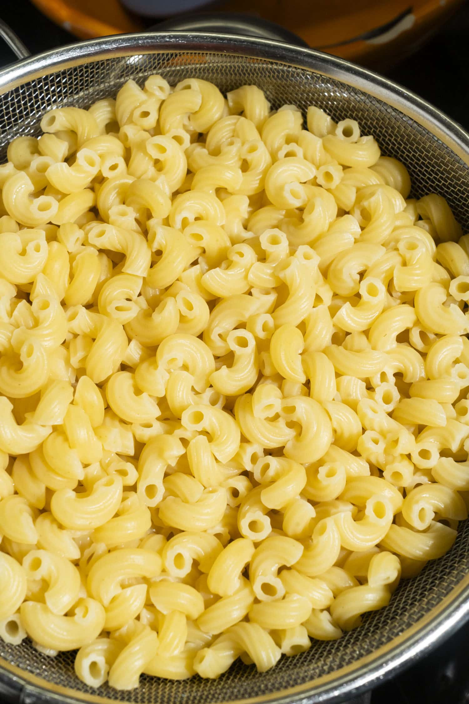 - Heat oven to 350 degrees F. Make elbow macaroni according to box. Drain and then place in a 11×8 baking dish.